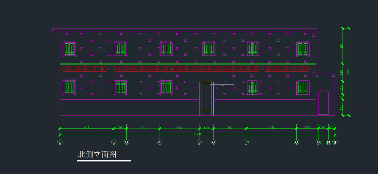 借助X300三維激光掃描儀獲取的點云數(shù)據(jù),導(dǎo)入到CAD軟件中,可以很直觀的在軟件中看出建筑立面的相關(guān)材質(zhì)和邊界、門窗位置的相關(guān)性、墻面的雕刻和紋理等要素。
