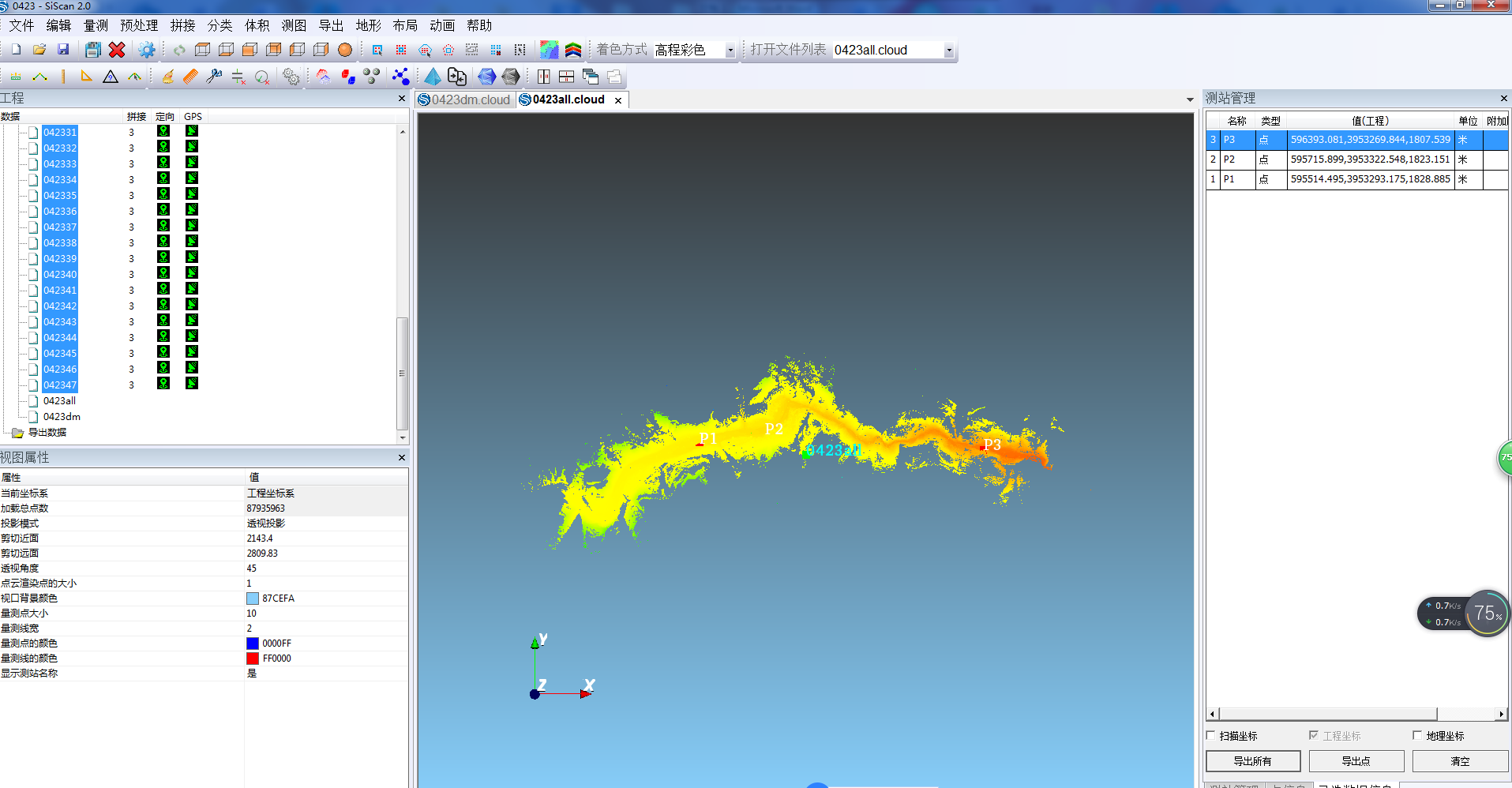 X300三維激光掃描儀及其配套處理軟件,在此次項目中使用到的功能有:自動化點云預處理、帶GPS測站坐標的高精度自動化拼接、GPS定向、整體點云成果的去噪和智能化抽稀、點云TIN漸進加密分類、自動化三維地形制作、DEM可三維可視化編輯、成果點云AOI感興趣區(qū)域輸出(CASS格式)、自動化等高線制作等。