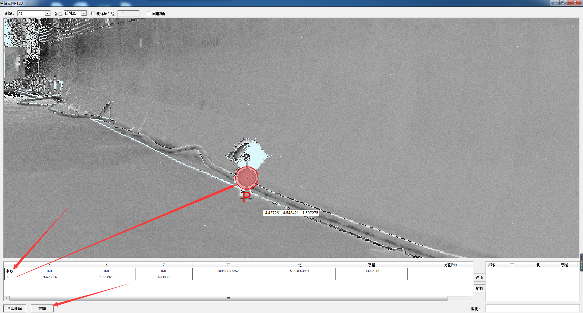 對(duì)導(dǎo)入的點(diǎn)云進(jìn)行定向(根據(jù)現(xiàn)場(chǎng)全站儀獲取的標(biāo)靶球和儀器中心的地理坐標(biāo)進(jìn)行定向