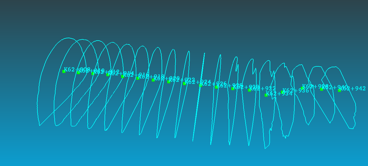 根據(jù)現(xiàn)場全站儀獲取的標(biāo)靶球和儀器中心的地理坐標(biāo),對導(dǎo)入的點(diǎn)云數(shù)據(jù)進(jìn)行定向。完成以上步驟后,開始進(jìn)行斷面線生成,將設(shè)計線路(平曲線、豎曲線)拖入到點(diǎn)云數(shù)據(jù)窗口中: