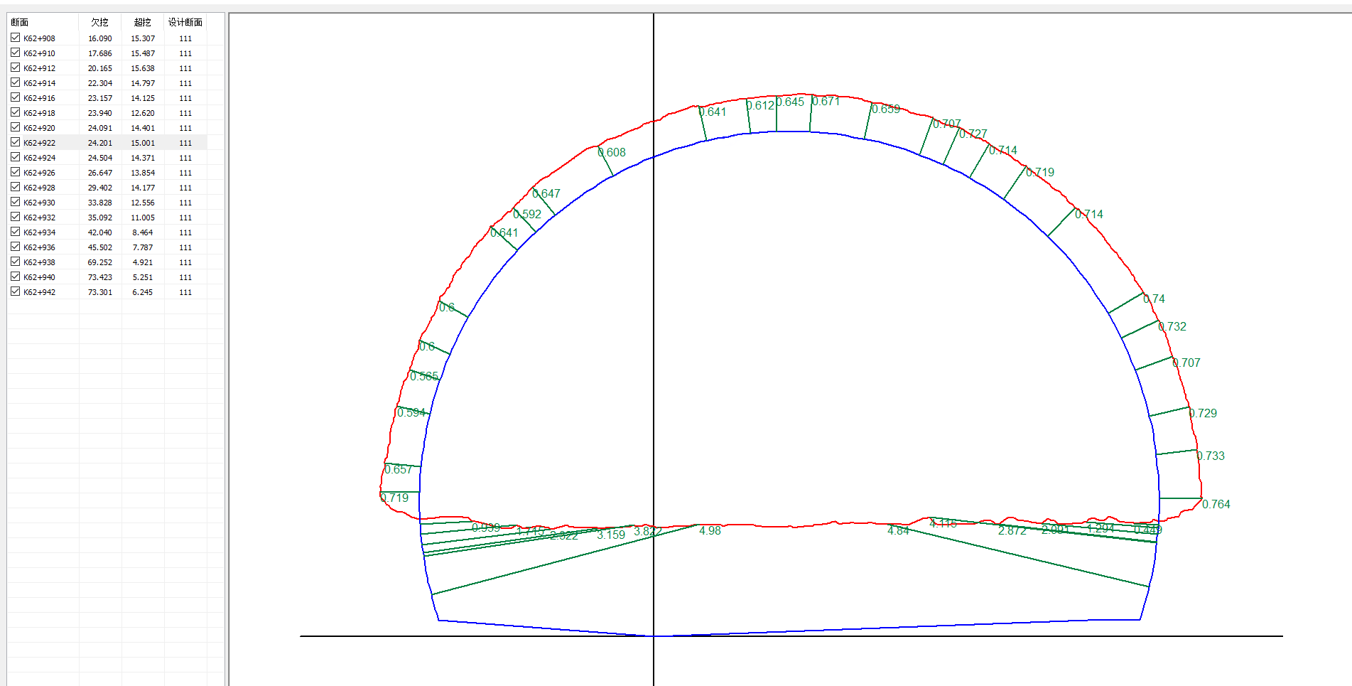 紅色為一襯實(shí)測斷面,藍(lán)色為二襯設(shè)計斷面
