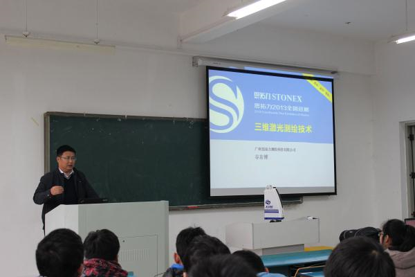 2013年12月16日下午,應(yīng)城建與環(huán)境學(xué)院測繪工程實(shí)驗(yàn)室邀請,廣州思拓力測繪科技有限公司總工程師谷東博,思拓力公司安徽服務(wù)中心總經(jīng)理李耀洲等一行5人,到學(xué)校為正在進(jìn)行“3S”技術(shù)實(shí)習(xí)的2011級地理信息科學(xué)專業(yè)的同學(xué)作了一場《三維激光測繪技術(shù)》專題講座。