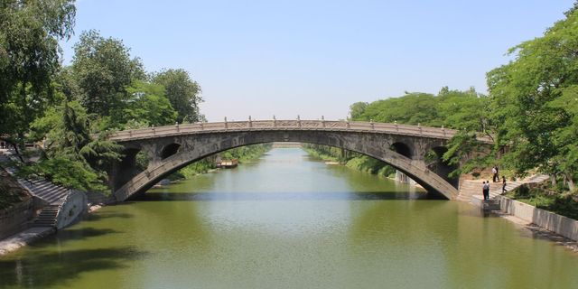 趙州橋,坐落在河北趙縣洨河上,被譽(yù)為“天下第一橋”,距今已有1400多年的歷史,是目前世界上現(xiàn)存最早、保存最完整的古代單孔敞肩石拱橋。▼