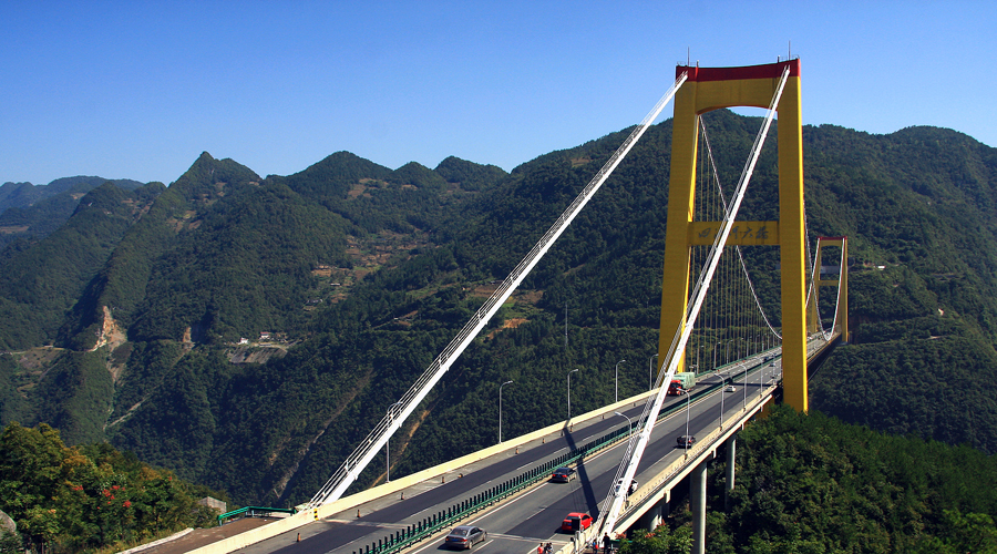 四渡河大橋,地處湖北宜昌與恩施交界處,被譽(yù)為“天路中的天橋”,是目前國內(nèi)在深山峽谷里修建的全橋最長懸索橋,同時也是世界首座跨度達(dá)900米以上的山區(qū)特大懸索橋。▼