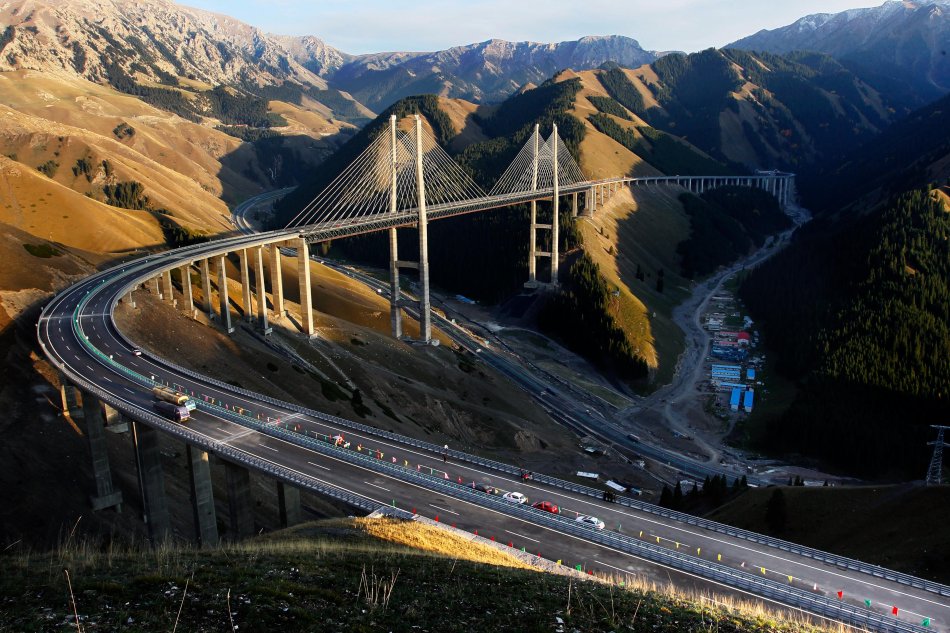 果子溝大橋全稱果子溝雙塔雙索面鋼桁梁斜拉橋,橋面距谷底凈高達(dá)200米,主塔高度分別為209米和215.5米。大橋主橋全部采用鋼桁梁結(jié)構(gòu),使用國內(nèi)特殊專用橋梁鋼材17000噸,并采用高強(qiáng)螺栓連接,安裝精度控制在兩毫米以內(nèi)。果子溝大橋是新疆公路第一座斜拉橋,也是國內(nèi)第一座公路雙塔雙索面鋼桁梁斜拉橋。