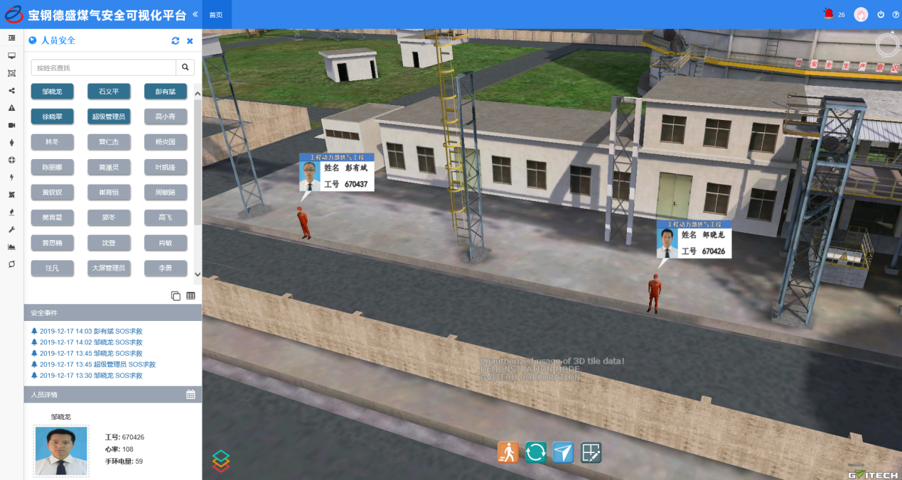 然后,通過虛擬算法在三維可視化管理平臺里實時呈現(xiàn)每位巡檢人員的信息,包括人員行走狀態(tài)與位置、歷史軌跡查詢、人員位置與監(jiān)控視頻自動聯(lián)動,以及SOS報警觸發(fā)視頻監(jiān)控自動尋找、報警位置自動上傳等,以最快的響應(yīng)速度保障巡檢人員的生命安全。