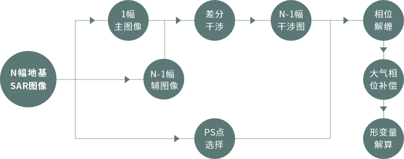 雷達設(shè)備基于SAR原理首先獲得被測區(qū)域的雷達二維圖像,將先后獲得的多幅雷達圖像序列進行配準(zhǔn)后,系統(tǒng)完成永久散射點(PS點)選擇、相位提取、相位解纏繞、相位校正、形變量解算及時間空間濾波等處理,系統(tǒng)可以獲得被測區(qū)域各空間位置的形變信息,并經(jīng)地理信息融合、三維圖形轉(zhuǎn)化、自動報表生成、預(yù)警與告警處理等,將形變信息、告警信息以不同形式提交給用戶。